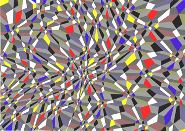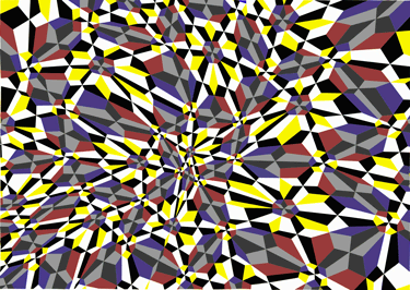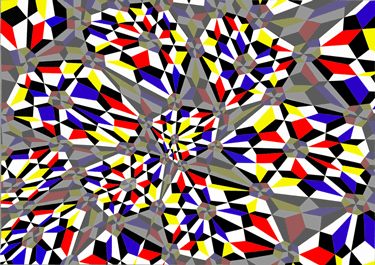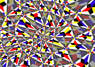 A filed of all the irregular six point stars that are red in the uppermost point, yellow in the left and blue in the right. As with the cubes each of the star facets are shared by interlocking stars.