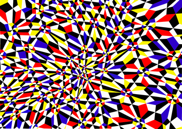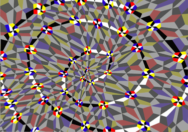 The drawing for the original image, a 19.5" x 27.5" watercolor, began as an irregular spiral, onto which I drew a lattice of triangles. This was then subdivided into hexagons and, further, into irregular quadrilaterals. Just as all of the lines tip off vertical and horizontal, all of the shapes are intentionally unique and eccentric. Both the tangent black and white and the three primary colors recur every third step along three axes. The resulting field can be read alternately as patterns of interlocked hexagons, cubes, stars, stairsteps, etc. Although I intend for these competing illusions to be difficult to grasp and hold onto, I thought it might be an instructive use of this site to isolate them. A slide of the painting was scanned into Photoshop, where the colors were made consistently intense. A copy was made, reduced in brightness and contrast, and laid over the original. I then "cut out" various patterns, exposing the intense colors of the layer beneath. Nine variant readings, set against the original, can be viewed by moving your mouse over the selections below. Both the original image and each selection links to a larger versions of the respective image.