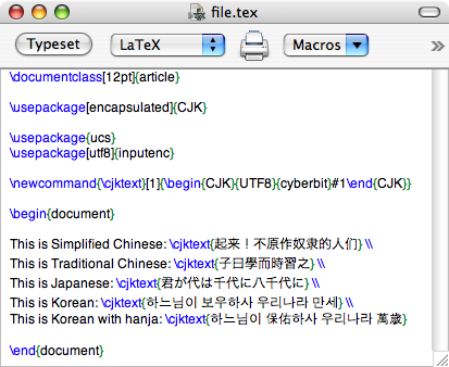 In your LaTeX document, when you want to use CJK, all you have to do is enter the \cjktext{} command and type the Chinese, Japanese, or Korean inside the braces. Here is an example file and output using CJK: