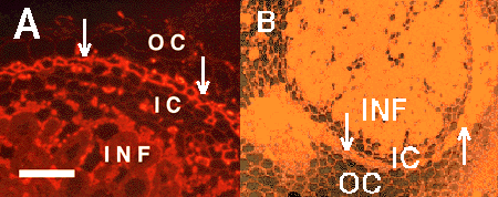 Photomicrographs of root nodules of alfalfa (A) and bean (B) showing fluorescence immunolabeling of ascorbate peroxidase in the endodermis (arrows, between the outer cortex [OC] and inner cortex [IC]) and in the infected [INF] central region. The bar equals 100 µm.