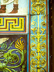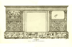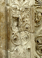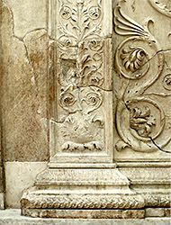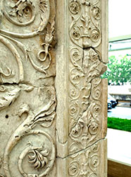 The important surviving marble remnants of this doorway indicate that, unlike most other surfaces of the Ara Pacis, the doorways were relatively plain with restrained molding. In contrast, all the pilasters, including the major corner pilasters, and the base moldings were highly embellished. No remnants of the entablature survived. Judging by images on coins which seem to represent this facade (image on page 1), the entablature would have been larger, more ornate, and would have included acroteria protecting upward at the corners.