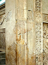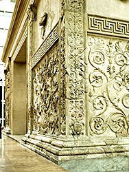 View of the original north-east corner of the Ara Pacis, important parts of the pilaster and base molding well preserved.