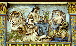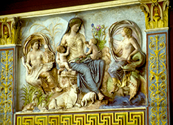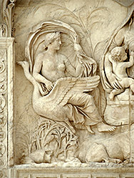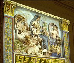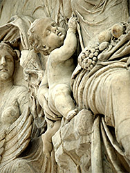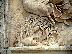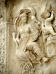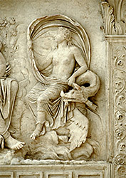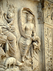 The size of the central goddess, and her position facing inward toward the doorway, echo that of Roma on the opposite panel. However, other comparisons between the 2 panels are difficult if not impossible because only 2 small fragments of the Roma panel survive. The number and variety of figures, animals, reptiles, and birds on this panel exceeds that on any of the other frontal relief panels.