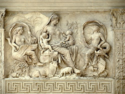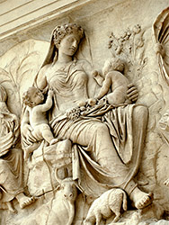 Most often the panel has been interpreted as Pax, Italia, Tellus, or Venus, recently Ceres. In recent years, some scholars have accepted a synthetic view, suggesting that the relief may have been deliberately designed to encompass all of these meanings, perhaps with an intensional degree of ambiguity to reference the full Augustan programme, and to speak to the entire Roman populous. While this may well be true, the nature of Roman art suggests that there would have been a primary identification of the major figure.