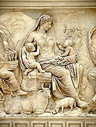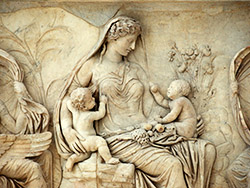 "Entire figure of the child, except his hand and right leg, is a [probably early] reconstruction, as is the nearby hand of Tellus and the adjacent piece of drapery".