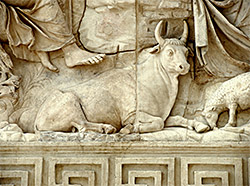 The entire right section of the ox, including head and forelegs, is an early reconstruction. A later relief, partly a copy, shows the ox head looking more to the right.