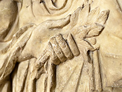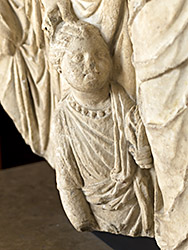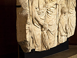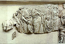 In the Louvre the Ara Pacis slab is exhibited close to the floor, at a level more appropriate for an ancient sarcophagus. Thus viewers are looking slightly down at the relief instead of from varying distances looking up, as Augustan viewers would have seen the original monument (see next image to right).