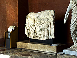 Scholars agree that the 1938 reconstruction of the Ara Pacis, preserved within the new Musée dell'Ara Pacis as seen here, approximates its original design. On the monument in the museum, the cast of the Louvre slab is located near the left side of the processional frieze, as seen in this photo.