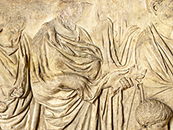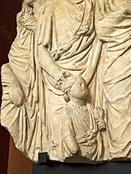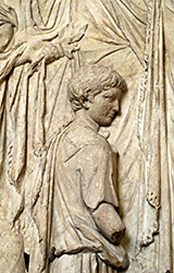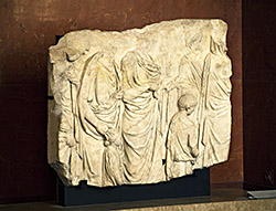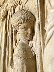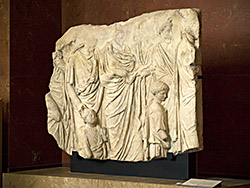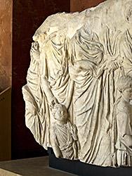 Louvre Slab: The first large slab now toward the left side of this processional frieze is a cast of the original marble slab now in the Musée du Louvre, Paris (acquired 1861-63 as part of the collection of the Marchese Campana: Inventaire Cp 6468, n. usuel Ma 1088). Because this original slab has been well preserved, its evidence is especially valuable, but very few adequate photographic details have been published. A variety of high resolution images help us to study various aspects of this original slab including details of carving, treatment of hair, faces, and clothing, comparison with the copy on the Ara Pacis in Rome, and proposed identification of figures. The identity of each of these figures has been debated by scholars. The 13 photographs of the Louvre slab on this page were taken in July 2012 and added to this web page August 7.
