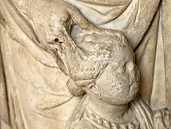Face of an older boy seen almost full-face. Much of the original carving of the face is well preserved. Later infill is clearer than in black-white photographs. The partial merging of the head with the background is characteristic.