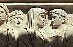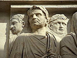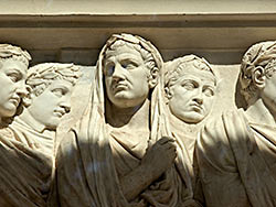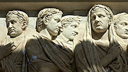 The only heads to survive with their original carving are the few profiles in very low relief, barely emerging from the background. Although worn, these capture the characteristic verism of Roman portrait sculpture. Even the very low relief figures at the left of this procession, seen here on a plaster cast of the original marble slab in the Louvre, convey the character of the original Ara Pacis. The recarved heads, however, give the impression that Roman portraiture could be neo-classical in style. Judging by the few Renaissance drawings that record some of these figural slabs, about half of the heads are complete recreations rather than recarvings of the original Ara Pacis heads.