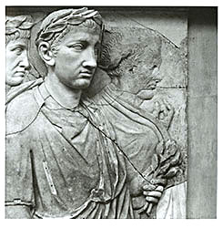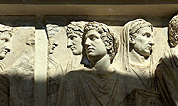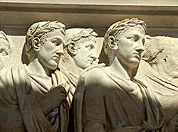 Members of a college with priestly duties, the septemviri (figures 11-9). The head at right in low relief is one of the rare heads that were not recaved and thus retains much of its original Augustan character.