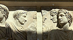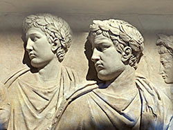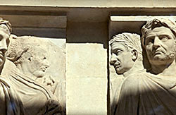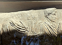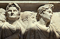 Members of a college with priestly duties, the septemviri (figures 13-12). The head at right in low relief is one of the rare heads that were not recaved and thus retains much of its original Augustan character.