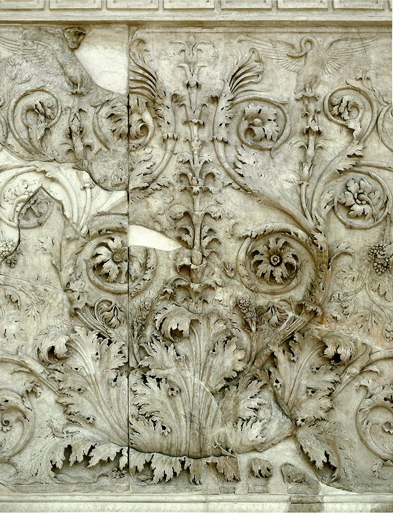 Apart from a few deliberately left voids, one infill piece, and a bit of plaster to fill cracks, everything we see on this portion of the relief is part of the original Ara Pacis Augustae. This section of the scrolling acanthusl frieze has survived with relatively little damage or restoration and is the best large section of the entire monument in which to see the remarkable quality of the original carving. Apart from the virtuoso undercutting, differentiation of forms, and subtlety treatment of surfaces, the ability of the sculptors to convey so convincingly the strength and vitality of vegetal life equals the finest examples in the history of art.