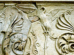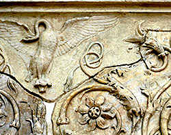 The 2 swans at top, on either side of the center of the frieze, are the best preserved swans on this scrolling acanthus frieze.