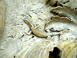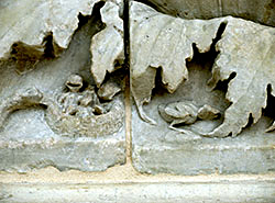 Bottom-center of the scrolling acanthus frieze, with reptiles, birds, and a frog; details in photos below.