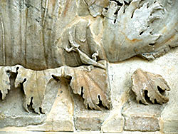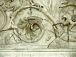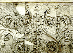 Details of the scrolling acanthus frieze on the exterior of the original north sde of the surrounding precinct wall.