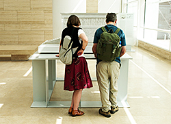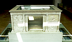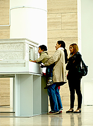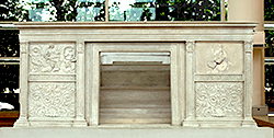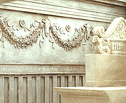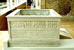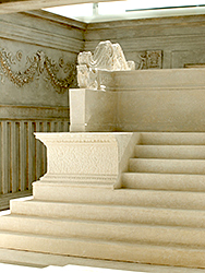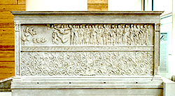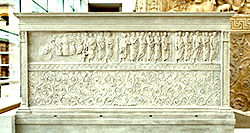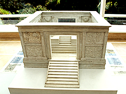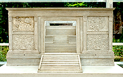 This exquisite model of the entire Ara Pacis provides the most informative overall view of this complex monument. Unlike the orientation of the Ara Pacis itself, this model has been installed oriented in the altar's original direction; the public avenue front facing east and the ceremonial entrance front facing west.