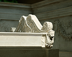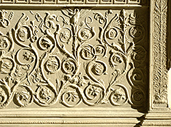 Detail of south side scrolling acanthus frieze in bright raking-sunlight.