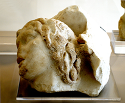 During the restoration of the 1980s, the head was removed from the Aeneas panel. Ever since then, it has been considered most likely part of the Roma panel, though it has never been inserted. In the recent color projection, an image of the head has been included as part of the Honos figure at the right of the Roma panel.