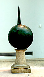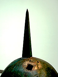 Upper portion of bronze globe in photo at left, showing the 4-sided, tapered spire.