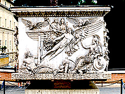 Front of the marble base of the now lost Column of Antoninus Pius (reigned 138-161 CE), thus dating from about 161 CE. On display at the Vatican Museum. The relief on this side of the base shows the apotheosis of the deified Emperor Antoninus Pius and his wife, Faustina, above a winged figure. At the right Roma leans on a shield with an image of the legendary founders of Rome, Romulus and Remus, suckled by the she wolf. Although not closely followed, this is a key image of Roma available for the hypothetical reconstruction of Roma on the Ara Pacis Roma relief.