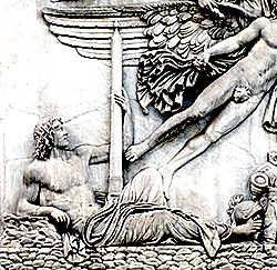 Detail of the marble relief in photo at left. The reclining male figure holds an obelisk, which seems closest in appearance to the Obelisk of Psametik II, which Augustus had reerected on the Campus Martius near the Ara Pacis. The figure holding the obelisk has long been considered a personification of the Campus Martius.