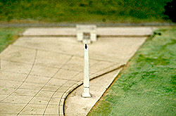 As reerected by Augustus, the obelisk was mounted on a new rose granite base, quarried from the same source as the original obelisk. The base was then inscribed on 2 sides (see photos and text next page) and a metal globe with spire attached to the obelisk's pinnacle. A travertine pavement with a single bronze guideline, with cross markers, known as the meridian, was installed, running approximately north of the obelisk. These cross lines marked the 360 degrees of the solar year. The obelisk then served as the pointer or gnomom of a sundial that tracked the length of the obelisk's shadow each day at noon. This made it possibe to confirm the accuracy Augustus' correction to the 365 1/4 day calendar. The obelisk also served as a fulcrum, helping to tie together the three major Augustan monuments in the area: the obelisk, Ara Pacis, and, most prominently, the Mausolum of Augustus.