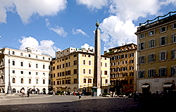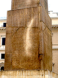 When Augustus erected the obelisk on the Campus Martius, a large, new base of Egyptian rose granite was added and inscribed. Although the Augustan inscription had been damaged and was partly reinscribed when the obelisk was reconsturcted and reerected in the Piazza Montecitorio, the reading of the inscription is secure because the same inscription appears on two faces of this obelisk and on two faces of the Augustan obelisk now in the Piazza del Popolo.