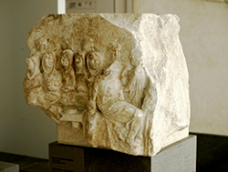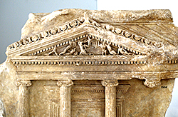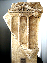Fragments of Luni marble sculpture on display in the lower level of the Museo dell'Ara Pacis. The fragment of a relief of a 4 columned Ionic temple facade, with pedmental sculpture, was found in 1923 on the west side of the Via del Corso. Usually thought to be part of the same monument as the Medici della Valle reliefs, perhaps part of the Ara Pietatis Augustae.