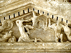 Upper portion of marble fragment in photo at left, showing pediment with battle scene.