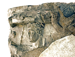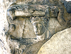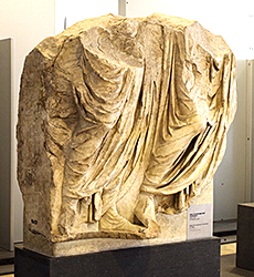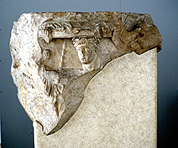 Marble fragment discovered in 1923. A male youth with tunic and laurel wreath carrying a veiled basket with pomegranates on his head, found in 1935 at Via del Corso, Rome.