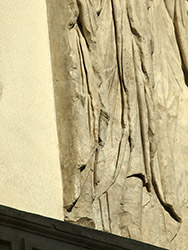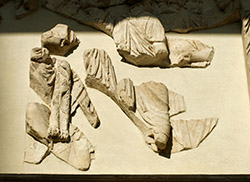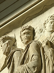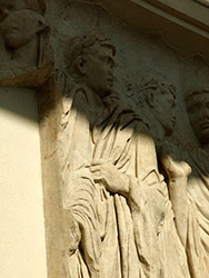 The figure of Augustus was carved on 2 adjoining marble slabs. He is only slightly distinguished from the other figures, some of whom turn toward him, others away.