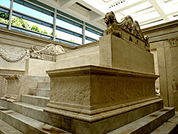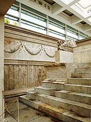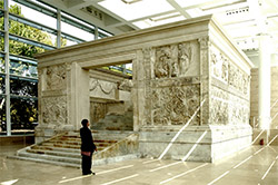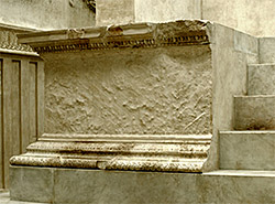 Reconstruction: The sacrificial altar is the center-piece of the entire Ara Pacis Augustae, yet much of its form and size is necessarily speculative. Very few original parts had survived so that when the archaeologists reconstructed it in 1938 much of its size and shape had to be imagined. The archaeologists have tried to make this clear by distinguishing between original marble and other parts, but this is not normally understood by the public.