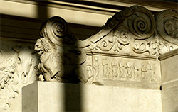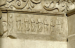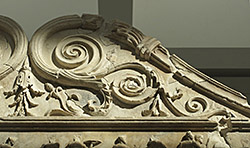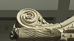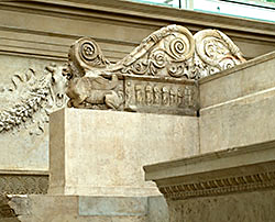 Inside of left wing resting on the hypothetically reconstructed u-shaped form, sometimes called the "prothesis", with recombant lion-griffin, crowning scrolls, and relief of vestal virgins.