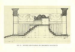 "Plate 6 - Longitudinal section of the reconstructed monument - Ennio Paolini". Vertical cross-section from front (at left) to back, showing relation of sacrificial altar to the enclosing precinct wall.