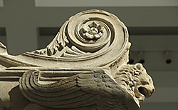 Outside of powerful vegetal scroll above lion-griffin at back of left wing.