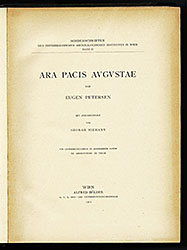 The text volume was scanned from Eugen [Adolf Hermann] Petersen, and George Niemann, Ara Pacis Augustae. mit zeichnungen von George Niewmann; VIII Lichtdrucktafeln in Besonderem Bande, 60 Abbildungen im Texte. Sonderschriften des Österreichischen Archäologischen Institutes in Wien, Band II. Wien: Alfred. Hödler, K. U. K. Hof- und Universitäts-Buchhändler, 1902. Reproduced with appreciation.