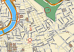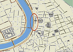 Detail of map with Ara Pacis indicated between Tiber River and Mausoleum of Augustus, 2009.
