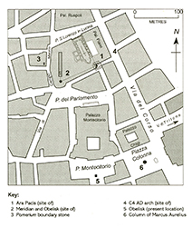 "Fig. 1. Plan showing position of obelisk, Ara Pacis, Mausoleum and other features mentioned in the text".