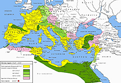 "Extent of the Roman Empire under Augustus; the yellow legend represents the extent of the Republic in 31 BC, the shades of green represent gradually conquered territories under the reign of Augustus, and pink areas on the map represent client states; however, areas under Roman control shown here were subject to change even during Augustus' reign, especially in Germania."