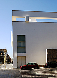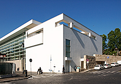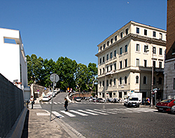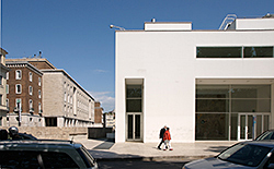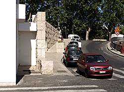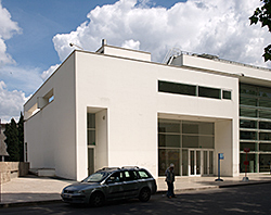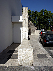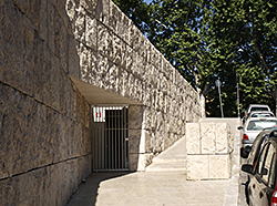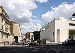 The variety of exterior entrances to the back building include service entrances at the bottom of the tall north-east corner and more formal office and auditorium entrances along its upper, west side. An open-air roof patio is used for special events. This design makes it possible to hold events or rent the auditorium, adjoining hall and facilities, without access to the Ara Pacis. The change with the largest public impact was the addition of a lower story, barely visible from outside, used for temporary exhibitions of contemporary art. Although most of these have no direct relatonship to the Ara Pacis, they have been highly popular, transforming to some extent the nature of the museum.