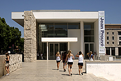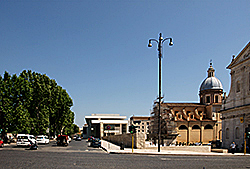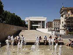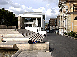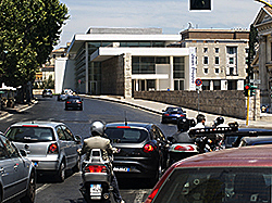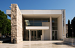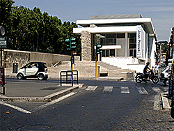 The new Museo dell'Ara Pacis was designed by Richard Meier and Partners and opened to the public in 2006. The front of the museum is visible from a distance as one approaches from the south. its pervasive rectangular design, characteristic of the international style of the past half-century, contrasts with that of the landmark churches to its right, while harmonizing with the 1939 Fascist office buildings on the other three sides of the Piazza. A grand approach is provided by the expansive staircase, beyond which visitors are welcomed by a recessed, glass-fronted entry.