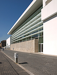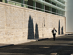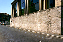 In addition to the Ara Pacis itself, this wall is the only survival from the 1938 pavilion that was incorporated in the new 2006 museum. In 1938-1939 the Res gestae Divi Augusti ("Deeds of the Divine Augustus") was engraved on the travertine east wall of the new pavilion constructed to house the Ara Pacis, and bronze letters inserted.