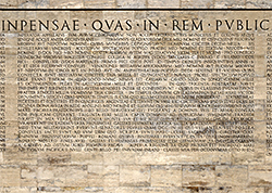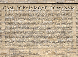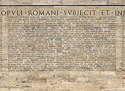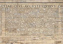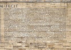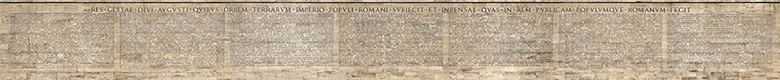 The title inscribed on the wall can be translated as "The Accomplishments of the divine Augustus by which he subjected the whole world to the power of the Roman people, and the expenses which he paid for the Republic and Roman people".
