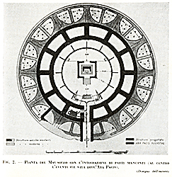 “Fig. 2. – Plan of the Mausoleum with the integration of missing parts (at the center the eventual hall of the Ara Pacis).