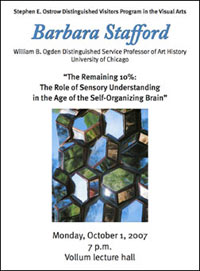 Barbara Maria Stafford is the William B. Ogden Distinguished Service Professor, Emeritus, at the University of Chicago. On Monday, October 1 2007, Professor Stafford presented her most recent research and observations on cognitive image histories in a series of talks including: a public lecture entitled "The Remaining 10%: The Role of Sensory Understanding in the Age of the Self-Organizing Brain" for the Stephen E. Ostrow Distinguished Visitors Program in the Visual Arts; two workshops, one on "Attention" and the other on "The significance of tight-figure formats;" and finally, a classroom teaching session (Art 426 Sites of Visual Modernity in China, the "senior seminar" in art history). Stafford is at the forefront of a growing movement that calls for the humanities to confront the brain's material realities.