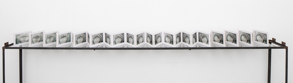 From the film I captured still images of the critical moments in the stages of embryonic development, 2- cell, 4 cell, 8-cell, 16-cell, 32-cell, 64-cell, 128-cell, morula, late blastula, early gastrula, mid-gastrula, late gastrula, and blastopore closure. I printed these images onto silk to make a 32-page,18.5’ x 5” limited-edition accordion book entitled Gestation. The images of the zebrafish eggs are printed onto translucent silk. Each page is mounted into a frame.