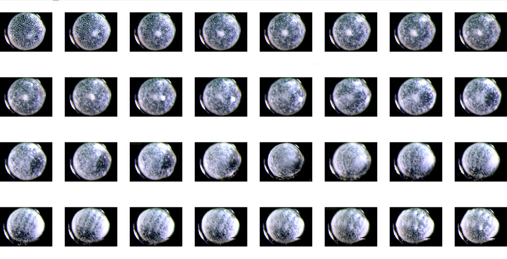 Cellular is a film of a blastopore, or a multiple-cell embryo. More than 200 hours of still images of each embryo were made with Atonics Micro fire digital cameras mounted on Olympus stereomicroscopes and made into a film using Astor IIDC imaging software. My colleague at Reed College, Steve Black, Professor of Developmental Biology and Zoology, provided me with a lab space to make the films of the blastopore. I worked with his lab assistant Allison Egar to make a film of development which was used for the still images. To make my film, I edited 10 film sections to overlap and repeat the phases of development just before a recognizable body is evident. Each segment represents the different eggs in the process of development. Each is edited prior to full gestation, creating a loop of endless potential. The film Cellular is overlaid with the recording of the Sound of Cells Dividing.