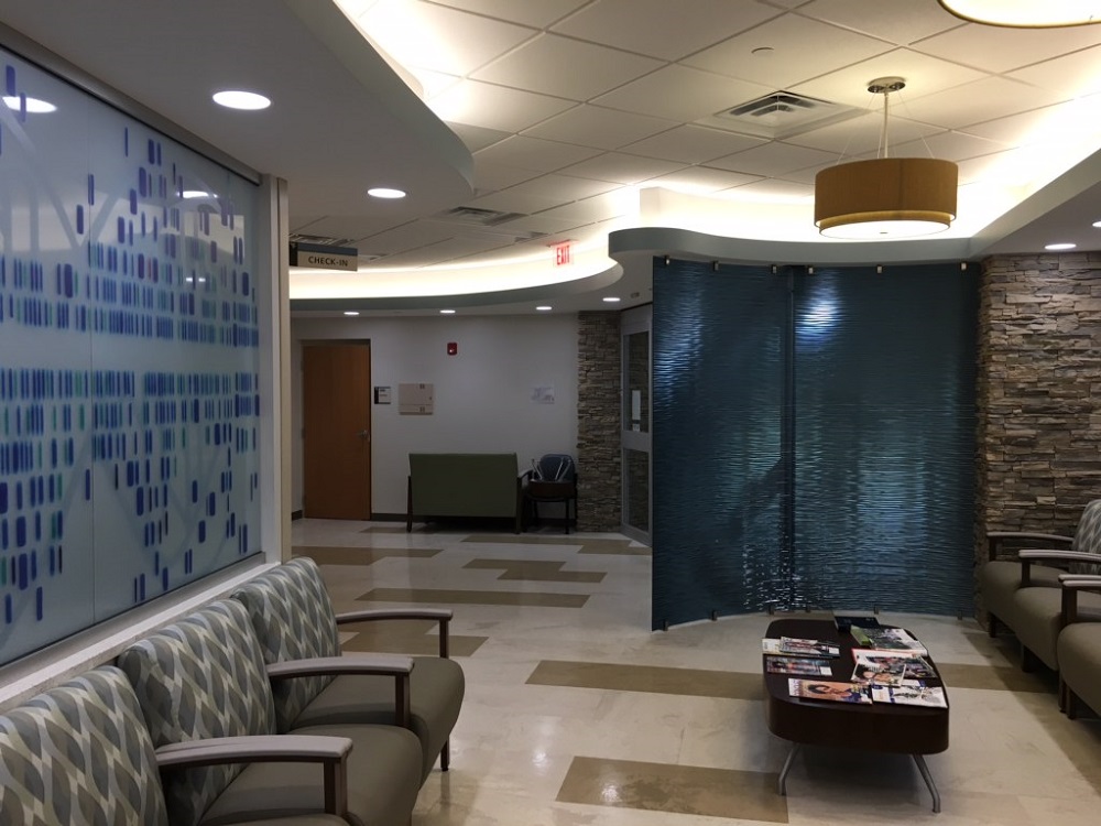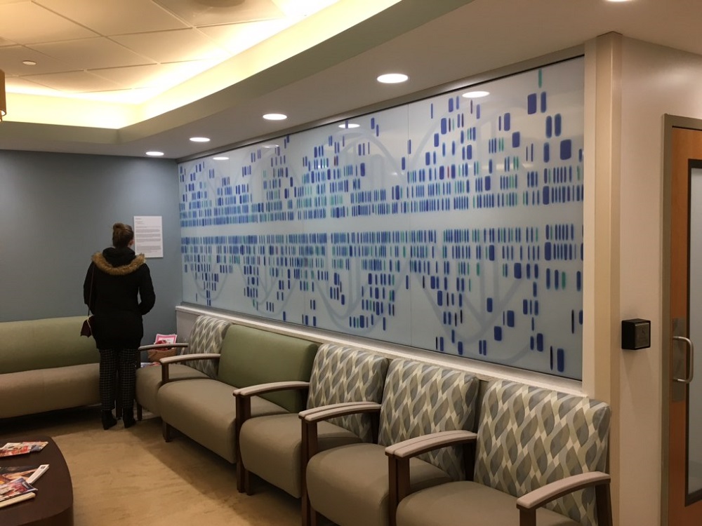 Commissioned permanent installation designed for the front lobby and waiting room window of the new Dorothy McCormack Center. Building design by Grove & Dall’Olio Architects.